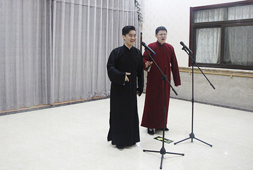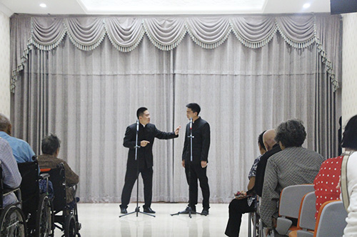 随着演员开场白的介绍,演出正式拉开了帷幕。等候多时的爷爷奶奶们为这几位年轻相声演员的到来送上了热烈的掌声。相声是土生土长的老北京人都喜欢的一门曲艺,小演员们绘声绘色的表演着,老人们听得很认真,脸上慢慢洋溢出幸福的笑容,快乐的感觉在心中荡漾开来。