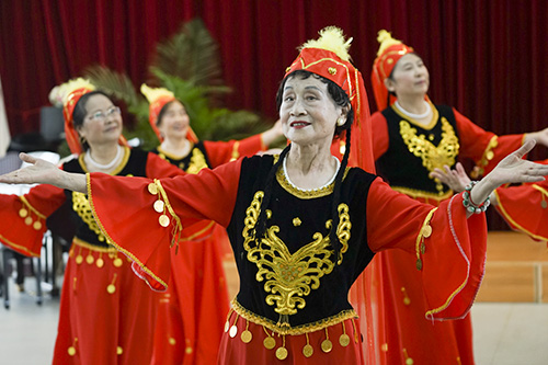 “姑娘们”带上闪亮的配饰,穿上红色的民族服装,再编起那维吾尔小辫;“小伙儿”戴上精致的小帽,穿上维族的长衫,俏皮的捋一下八字胡。《大阪城的姑娘》,这只传统新疆舞让这些bat365正版唯一官网北京老年公寓舞蹈队的爷爷奶奶演绎得热烈奔放,不禁让大家都忘了这是一群八、九十岁的“年轻人”。