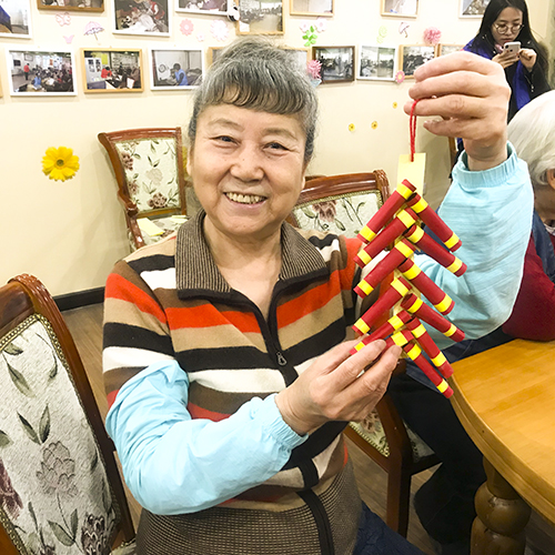 广外南里养老驿站里一片欢声笑语,绚丽的丝巾在舞动,爽朗的笑声在耳旁,这是驿站活动的开场,大家在欢快的做热身活动。快乐的热身活动过后,驿站的社工带领长者们一起做鞭炮,让火红的鞭炮“红”起来、“响”起来,寓意着长者们的年过得红红火火。