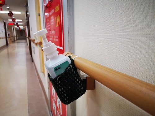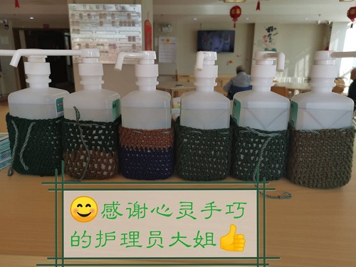 公共区域里,手消液的底托不够,无法悬挂在走廊的扶手上。心灵手巧的护理大姐用细致的手工编织出底托,让手消液在大家的必经之路上静静守护。