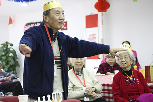 大家相互熟悉后,主持人就带爷爷奶奶进入“文斗”环节---猜猜猜,每人拿到一个卡片,卡片上写着自己所要描述的物品,通过自己的智慧向大家描述,为了让大家明白所表达的意思,表演者声行并茂地演绎,其他爷爷奶奶早已喜笑颜开了;经过“头脑风暴”后大家进入“武斗”环节———击球,爷爷奶奶们自行分为两组,在主持人的指导下击球,两组组员纷纷上场,最终积分高的小组获胜,获胜的团队得到精心制作的嘉奖卡片。爷爷奶奶在游戏后告诉我们喜欢这样同乐的感觉,无论得分是多少,重要的是团队在一起。