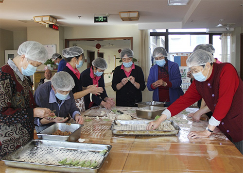 除夕当天的早上,我们的工作人员早早就准备好包饺子所需材料,分别送到了三楼和五楼大厅,桌子上也都提前铺好了保鲜膜,过一会,爷爷奶奶也都出来了,都挽起了袖子,戴好了口罩,准备和工作人员一起包饺子,他们一起分工合作,工作人员擀饺子皮,爷爷奶奶们包饺子,忙得不亦乐乎。