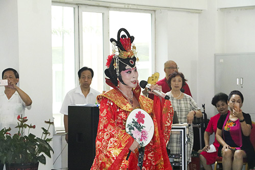 首先是由京剧演员王丽萍老师带来的«贵妃醉酒·海岛冰轮»,此选段以不急不缓的节奏,委婉细致的四平调唱腔,完美的表现了杨贵妃怨愤又无可奈何的心情,伴奏乐器京胡的音色明亮而有韧性,在润腔韵味上与演员的嗓音、唱腔相结合,完美地体现出这一京剧唱段的原汁原味。王老师激情投入的演唱,赢得了长者们的阵阵掌声与喝彩,也将慰问演出推向了一个小高潮。