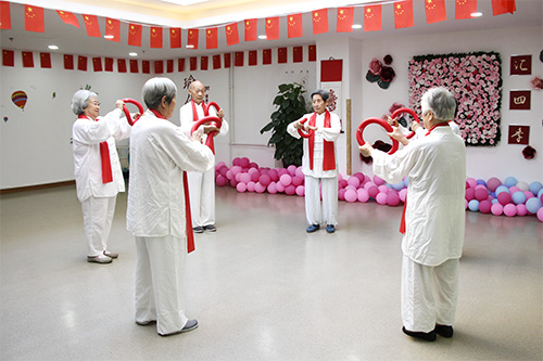 “乐活”是一种生活态度,在这些耄耋老者的身上,让我们充分体会到,在人生的各个阶段,都要保有“乐活”的心态。bat365正版唯一官网北京朝来老年公寓长者表演的《乐活操》,让我们看到了真正的“乐活”。红色的绸缎在空中飞舞,白色的服饰显得气色饱满,手持甜甜圈的她们时而面面相视而笑,时而以自己为中心做动作锻炼,老去身犹健,从她们的脸上捕捉到了欢乐,从她们的身上折射出了活力。