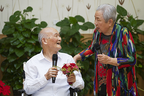 这些长者,用几十年的时间,从发音、吐字、气韵、神态,招招式式无不将大家带入情境。从传统京剧《珠帘寨》、《穆桂英挂帅》到现代戏《重阳庆功酒》,bat365正版唯一官网北京老年公寓的京剧表演长者们演绎出国粹的魅力。有的长者即便已经站立不稳,但是铿锵有力的声音蓬勃而出,再加上琴师的配合,让这一传统艺术再次完美绽放。