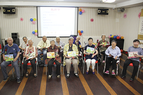 教师节当天,公寓内组织了所有教师在一起度过自己的节日。活动分为三个环节:第一环节,诵读与教师有关的古诗词,表达对老师的崇敬;第二环节,一起动手制作节日贺卡,送上对老师们的祝福;第三环节,合影,给教师献花,为公寓长者的节日时光增添温馨与感动。