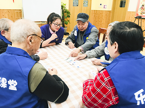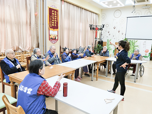 整个课程分为5款专业乐龄游戏,每次活动由一款专业游戏加一款活化大脑的手指操组成。为了达到有效的脑训练,我们一直让长辈在愉快的环境下,无意识的学习新技能。针对有些长者不愿意学习新事物、不喜欢被指挥的问题,我们有针对性的设计了一系列教材,陪伴长者一起进行游戏,让长者在各种游戏中取得成功经验,让长者喜欢上游戏,让新的技能写入大脑,有助于提升人际关系及降低失智的可能性。乐龄课堂从开课到现在已经成为最受长者欢迎的课程,参与此次活动的12位长者平均年龄86.1岁,90岁以上的有4位,年龄最长的是96岁的杨奶奶,她也是本次中央电视台《长寿时代》节目组采访的长者之一。