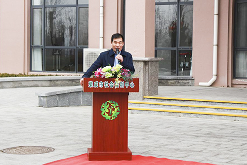 荣成市社会福利中心郭院长发表讲话,感谢赤山集团弘扬无私奉献的尊老、爱老、助老的志愿服务精神为福利中心捐赠车辆,让老人感受到社会大家庭的关心和温暖,并推动公寓养老服务质量,为在住老人营造更加舒适便利的养老环境。