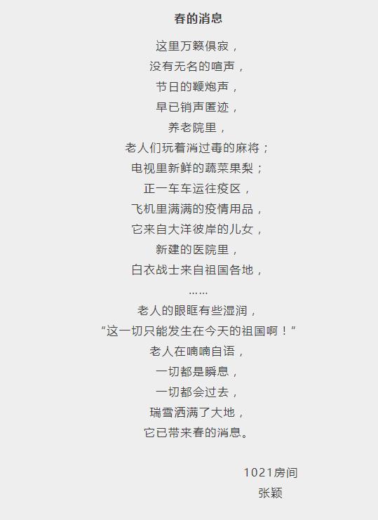 还有长者将心中感念化作诗歌,带来“春的消息”,为大家加油鼓劲。